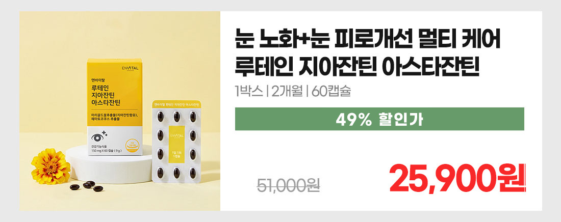 [마리골드꽃추출물(지아잔틴함유)] 노화로 인해 감소될 수 있는 황반색소 밀도를 유지하여 눈 건강에 도움을 줄 수 있음 [헤마토코쿠스추출물] 눈의 피로도 개선에 도움을 줄 수 있음
