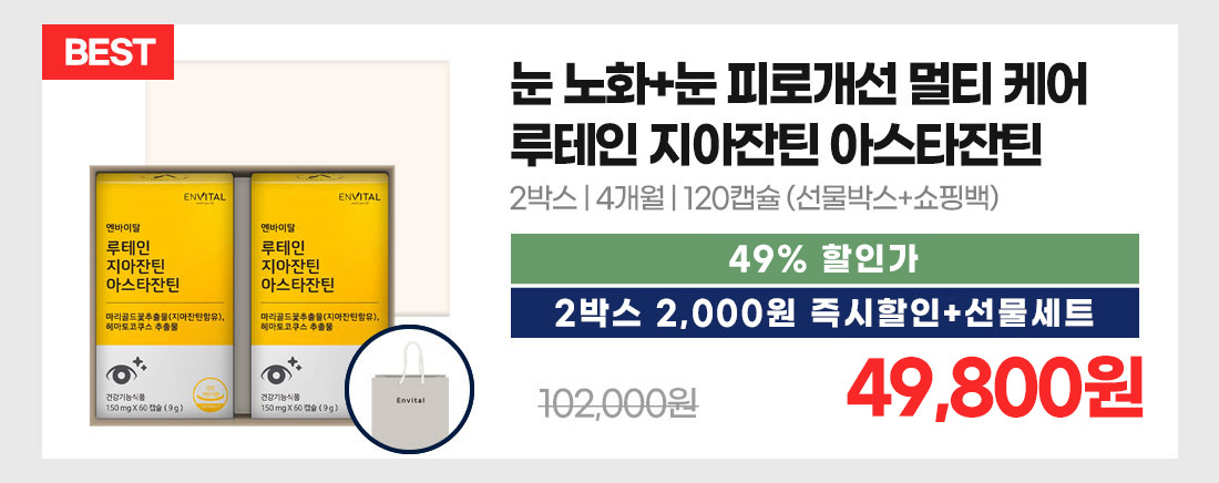 [섭취량 및 섭취방법] 1일 1회, 1회 1캡슐을 충분한 물과 함께 섭취하십시오. [섭취 시 주의사항] 섭취 시 목에 걸리거나 불편 할 수 있으므로 반드시 물과 함께 섭취하십시오. 섭취시 위장장애, 소화불량의 증상이 있을 경우 섭취를 중단하십시오. 개인의 신체 상 태에 따라 이상 증상이 생길 경우 섭취를 중단 하십시오. 섭취 전 제품에 이상이 있는 경우 섭취를 금하십시오. 특정 원료 성분에 알레르기 체질은 원료 성분을 확인 후 섭취하십시오. 영·유아, 어린이, 임산부 및 수유부는 섭취를 피하십시오. 흡연자는 섭취 시 전문가와 상담하십시오. 과다 섭취 시 일시적으로 피부가 황색으로 변할 수 있습니다. 이상사례 발생 시 섭취를 중단하고 전문가와 상담하십시오. B- 카로틴의 흡수를 저해할 수 있습니다. [보관방법] 수분 및 열에 의해 영향을 받을 수 있으므로 직사광선을 피해 서늘한 곳에 보관 하십시오. 어린이 손에 닿지 않는 곳에 보관하십시오. 이 제품은 난류(가금류), 우유, 메밀, 땅콩, 밀, 고등어, 게, 새우, 돼지고기, 복숭아, 토마토, 호두, 닭고기, 쇠고기, 오징어, 조개류(굴, 전복, 홍합 포함), 잣을 사용한 제품과 같은 시설에서 제조하고 있습니다.