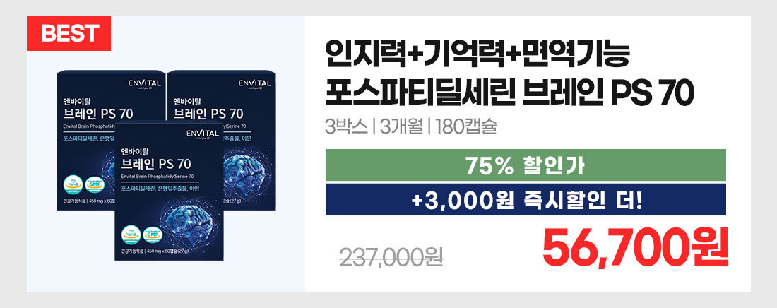 | 기능정보 | [은행잎추출물] 기억력 개선·혈행 개선에 도움을 줄 수 있음 [포스파티딜세린] 노화로 인해 저하된 인지력 개선·자외선에 의한 피부 손상으로부터 피부 건강 유지·피부보습에 도움을 줄 수 있음 [아연] ①정상적인 면역기능에 필요 ②정상적인 세포분열에 필요 |