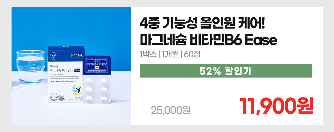 | 원료명 및 함량 | 1일 섭취량 : 2정(1.1g) 1일 섭취량 당 열량 0kcal, 탄수화물 0g (0%), 단백질 0g (0%), 지방 0g (0%), 나트륨 0mg (0%), 마그네슘 315mg (100%), 비타민B6 (100%) % 영양성분기준치 : 1일 영양성분기준치에 대한 비율 |