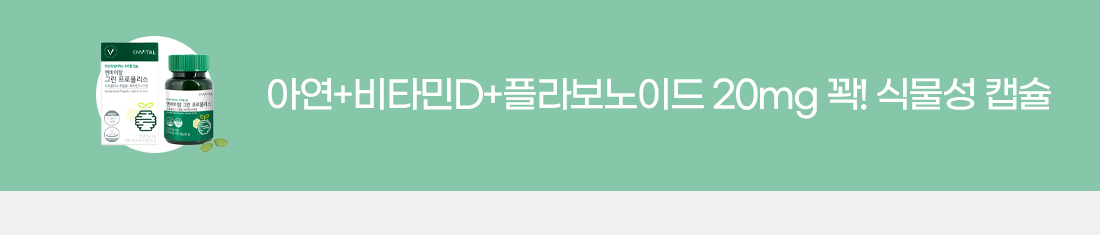 | 영양정보 | 1일 섭취량 : 2캡슐(1,000 mg) / 1일 섭취량 당 함량 : 열량 7kcal, 탄수화물 0.4g (0%), 단백질 0g (0%), 지방 0.6g(1%), 나트륨 0mg(0%), 콜레스테롤 0mg (0%), 총 플라보노이드 20mg, 비타민D 5ug(50%), 아연 2.55mg(30%) |