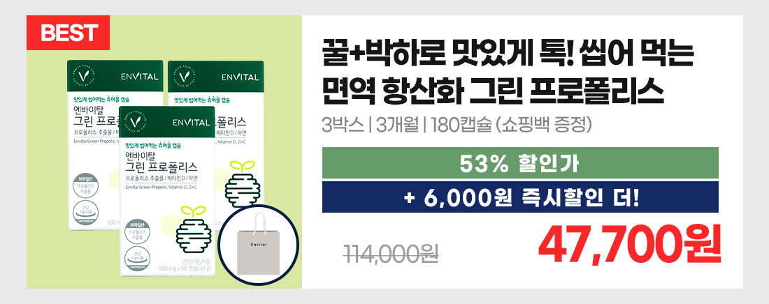 | 기능정보 | 프로폴리스추출물 : 항산화·구강에서의 항균작용에 도움을 줄 수 있음. 비타민D : 칼슘과 인이 흡수되고 이용되는데 필요, 뼈의 형성과 유지에 필요, 골다공증발생 위험 감소에 도움을 줌. 아연 : 정상적인 면역기능에 필요, 정상적인 세포분열에 필요. |