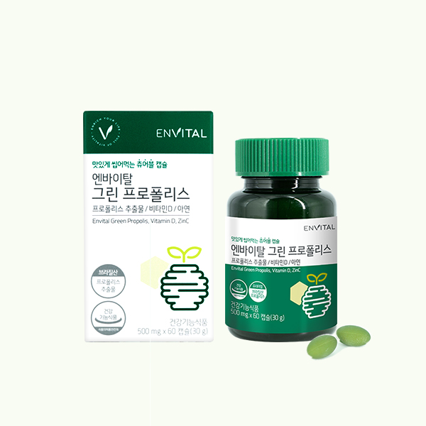 | 원료명 및 함량 | 프로폴리스추출물 : 항산화·구강에서의 향균작용에 도움을 줄 수 있음. 비타민D : 칼슘과 인이 흡수되고 이용되는데 필요, 뼈의 형성과 유지에 필요, 골다공증발생 위험 감소에 도움을 줌. 아연 : 정상적인 면역기능에 필요, 정상적인 세포분열에 필요. |
